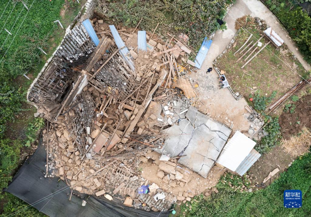 這是9月7日拍攝的雅安市石棉縣王崗坪彝族藏族鄉(xiāng)幸福村二組一戶倒塌的民房(無人機照片)。新華社記者 才揚 攝