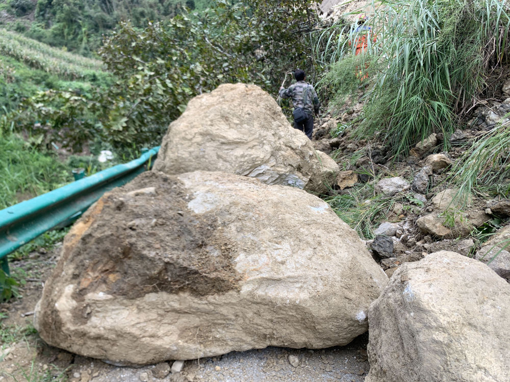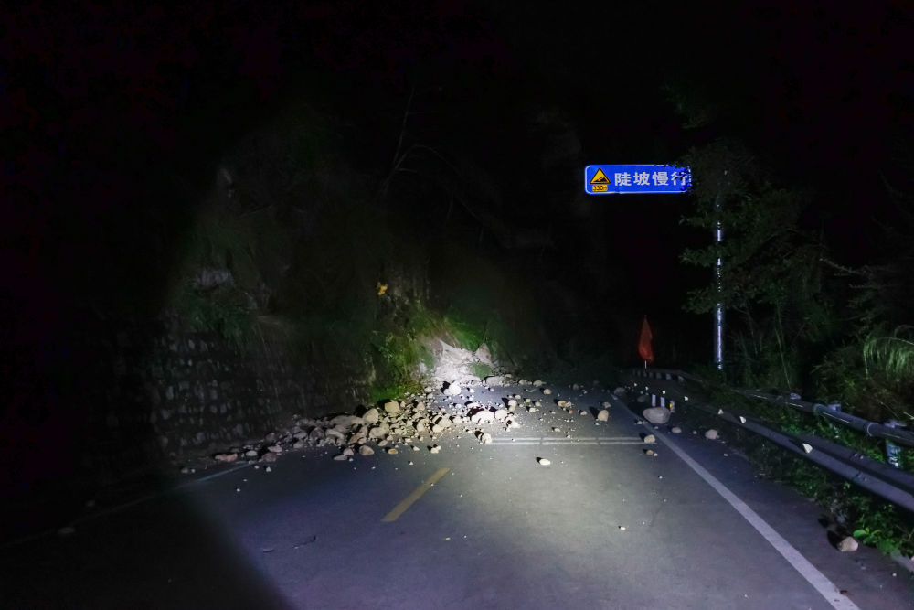 9月6日凌晨,通往得妥鎮(zhèn)的公路上,隨處可見震山體塌方后落下的碎石。