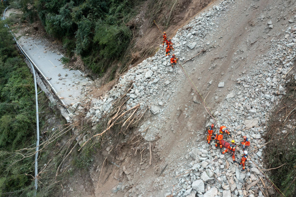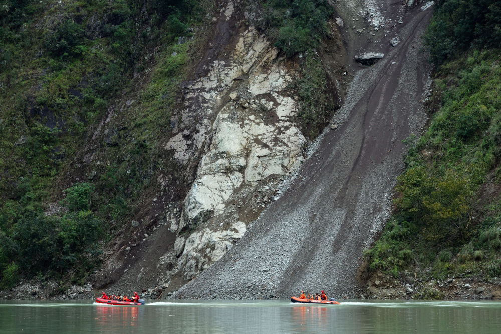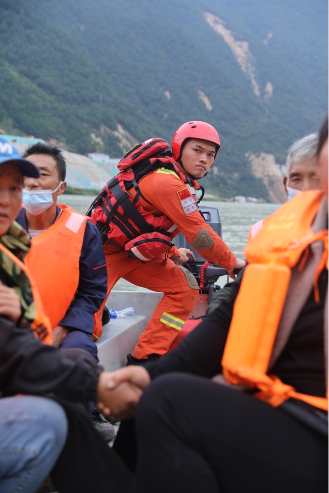 9月6日,救援人員乘坐橡皮艇經(jīng)水路,再爬山路進入灣東村。