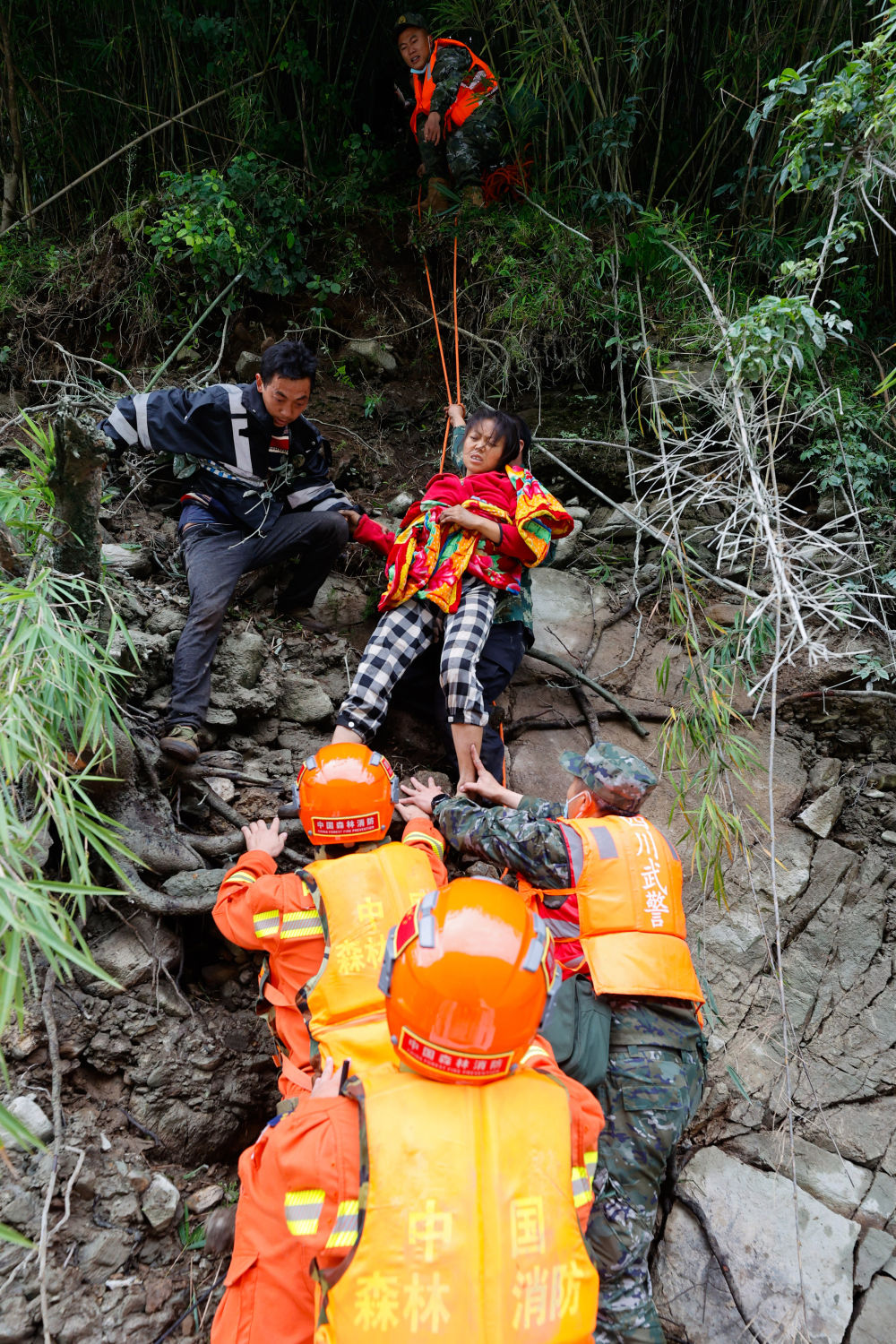 穿越了十余個這樣的路段,遠遠看到山下有人影晃動在齊人高的綠色植物之間,再往山上走。向導說他們是從灣東村一組上來的被困群眾。透過長焦鏡頭看到,一名精壯的小伙子赤裸上身,拿著鐮刀走在最前面為鄉(xiāng)親們開路,鄉(xiāng)親們跟在后頭,有的還背著孩子。幾名救援人員在變形的公路護欄旁接爬上來的人,一名背著孩子的婦女一握到解放軍戰(zhàn)士的手就哭了出來……待這批村民全部上到公路上后,救援人員護送他們返回紅花崗附近可以停直升機的疏散地點,然后再去山下接人。