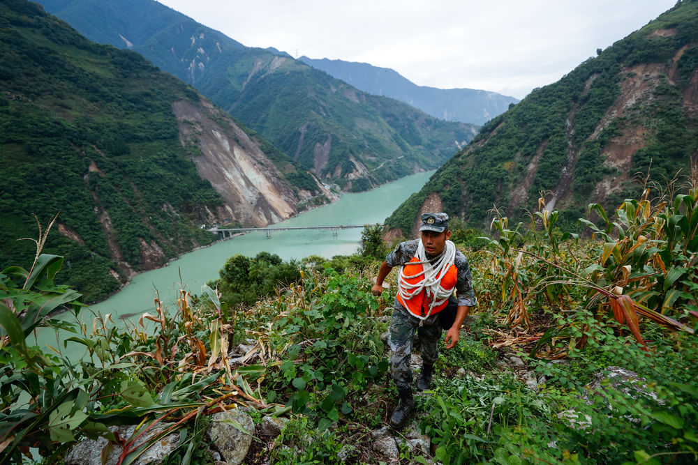熟悉地形的村民在前帶路。其實毫無“路”可言,我和救援人員只能沿著依稀可辨的足跡向上攀爬。山高陡峻,時不時會遇到山體傾斜角度大于60度的路段,只能手腳并用才能上去。為了減輕負重,我把巧克力這樣的補給都放在了山下,只帶了一瓶水在身上。很快,滿頭大汗,汗水流入眼睛刺得生疼。抬頭望著遙遠的需要翻越的山頭,對體力和耐性都是巨大考驗。一些救援人員因為工作需要,還背著很重的繩子,辛苦程度可見一斑。