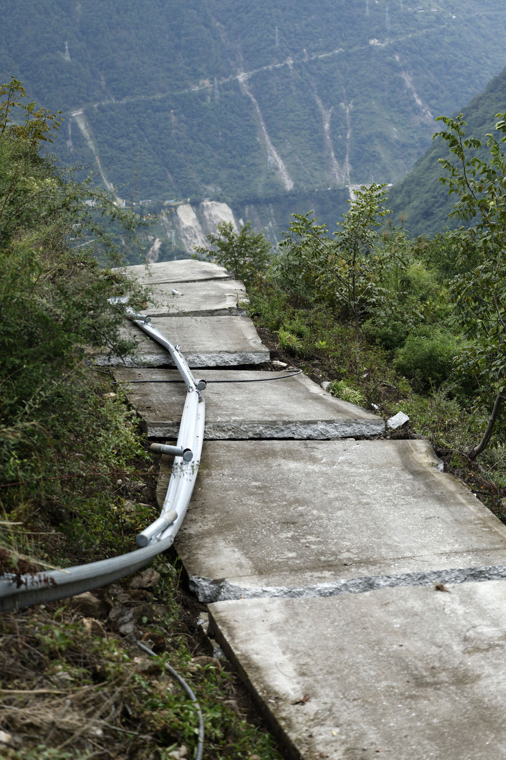 得知我們要去共和村,村干部叫來三輛摩托車,給車加了點汽油,送我們上去。上山的路本是只能容一輛汽車通過的水泥硬化路,經(jīng)過地震,沿途路面或裂開、或傾斜、或拱起、或塌陷,滑落的巨石和被撕扯下來的樹木把小路擋得只容摩托車通過,另一側就是深深的山溝。
