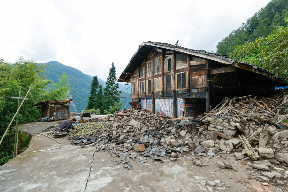 告別陳松林,沿村里的入戶路繼續(xù)往山下走,就到了共和村一組。這里的幾戶民房垮塌得也很厲害。劉芳的丈夫和兒子正在屋頂鋪防雨布。劉芳說,屋里有糧食,天要下雨,別給淋壞了。從房后貓腰小心穿過一片殘垣來到她家前院,院子的一角已垮塌,整個房子墻體裂了巨大的縫,完全無法使用。村里的很多房子都和劉芳家的差不多,據(jù)介紹,共和村一組有78戶,其中77戶的房子都在地震中受損嚴重無法使用。劉芳家是共和村一組剩下的最后一家人,下午他們也要轉移到位于磨西鎮(zhèn)的集中安置點。