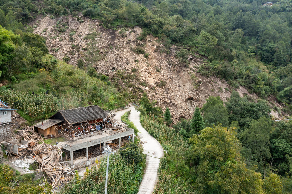 9月8日,共和村一組被地震損壞的民房。旁邊坍塌的山體本是盤山公路,如今已隱入山中不復存在。
