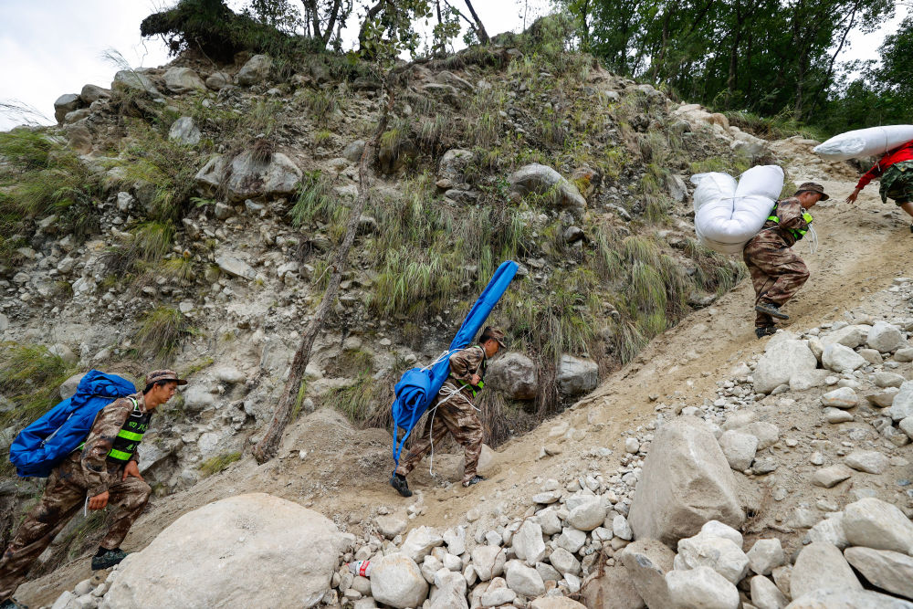 9月8日,在磨西鎮(zhèn)附近,救援人員沿著被地震損壞的小路向共和村運送救災帳篷。