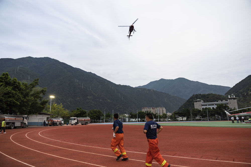 9月6日,在石棉縣中學的臨時起降點,應急管理部南方航空護林總站救援直升機在降落。