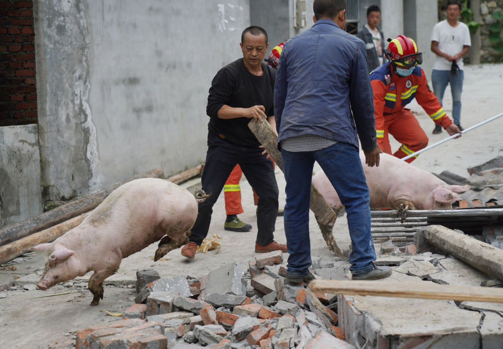 9月7日,在幸福村二組,消防救援隊員協(xié)助村民從倒塌的豬圈中轉移豬。