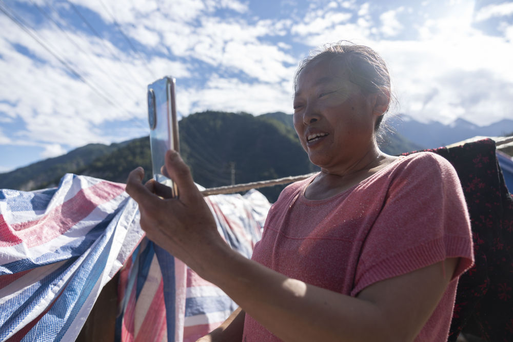 9月10日,在幸福村,技術人員安裝衛(wèi)星便攜站后,村民在與家人用手機進行視頻通話。