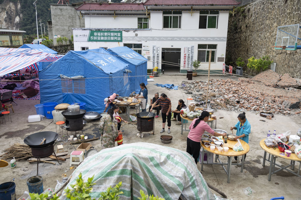 9月7日,在草科鄉(xiāng)政府安置點內,當?shù)厝罕姙樵趫鼍仍藛T準備飯菜。