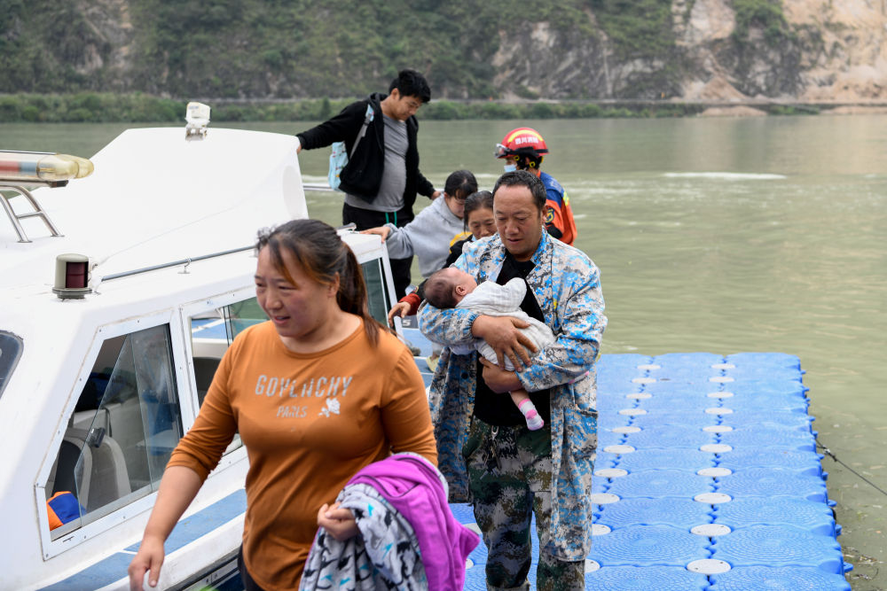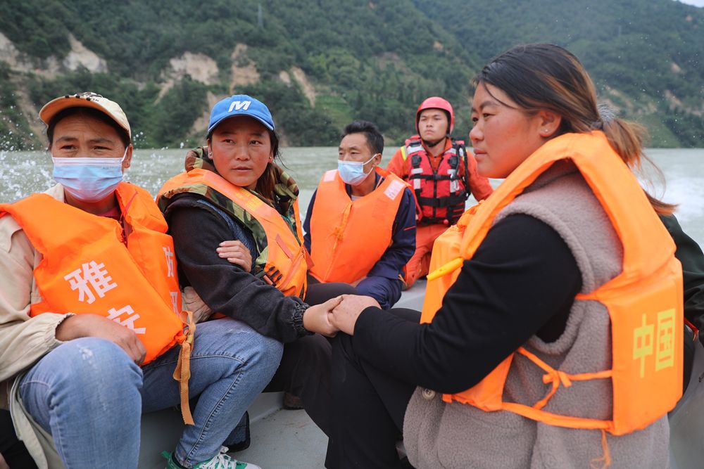 ↑9月8日,在四川石棉縣新民鄉(xiāng)臨時碼頭,救援人員駕駛沖鋒舟護送受災群眾回家。