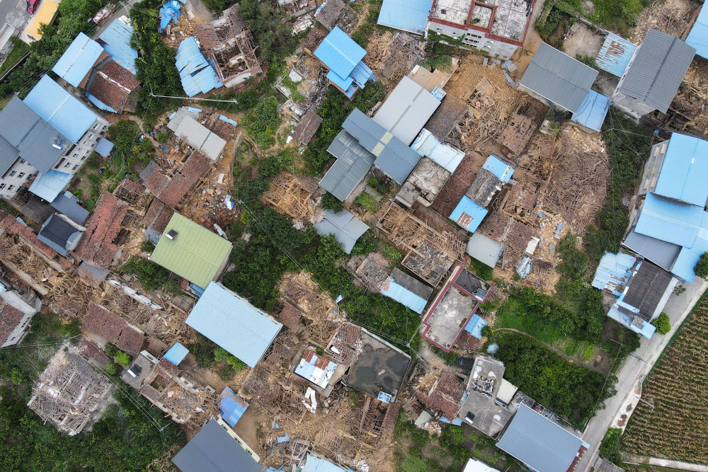 這張拍攝于9月6日的照片顯示石棉縣王崗坪鄉(xiāng)部分老舊房屋倒塌(無人機照片)。