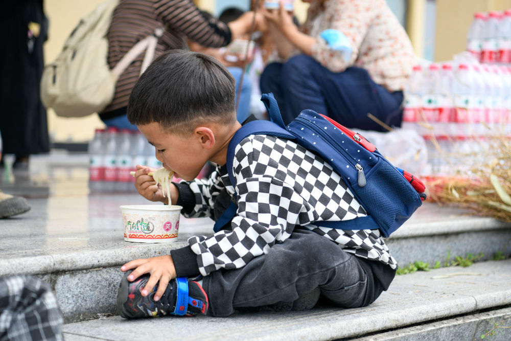 采訪當天,這個安置點里的伙食團依舊承包了在場所有村民、救援人員以及采訪隊伍的午飯,大家依次排隊領取,補充體力。一旁的草科鄉(xiāng)中心小學內,118名孩子也享用著熱氣騰騰的午飯。