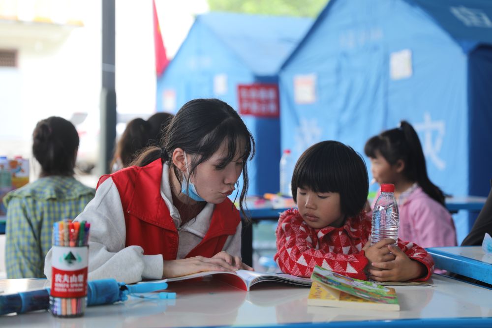 9月9日,在王崗坪鄉(xiāng)安置點內,志愿者在給小朋友講故事。