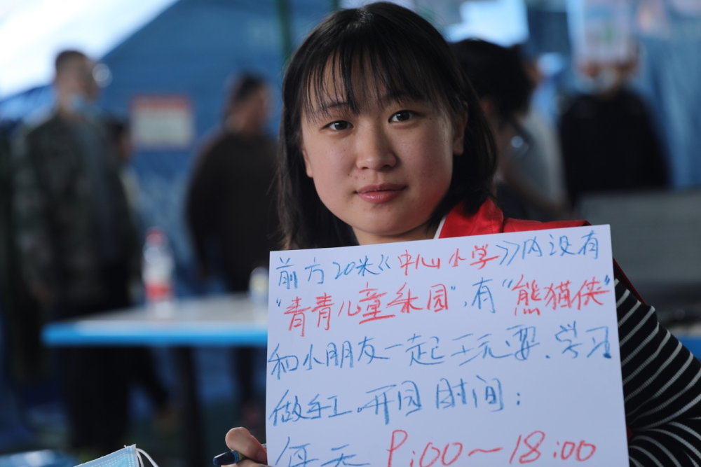 看到我手里的照相機,他們十分好奇。一位叫駱雅萱的小朋友拉了拉我的衣角說:“姐姐,我想用你的相機給‘熊貓俠’拍一張照片好嗎?”“熊貓俠”是這里的一名志愿者,地震發(fā)生以來一直在安置點陪伴著小朋友們,大家都很喜歡她。我答應了小朋友的請求,教她按下快門,看到自己拍的照片,她開心地給“熊貓俠”展示。
