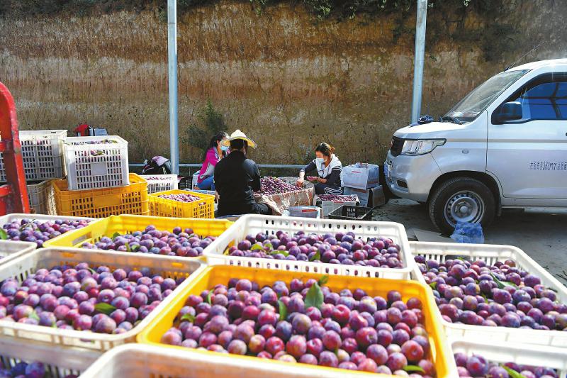 近日,在汶川縣綿虒鎮(zhèn)玉龍村,村民在分揀采摘的紅脆李。 伍排勇 攝