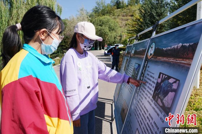 圖為青海野生動(dòng)物救護(hù)繁育中心副主任通過(guò)展板向?qū)W生介紹兔猻。馬銘言 攝