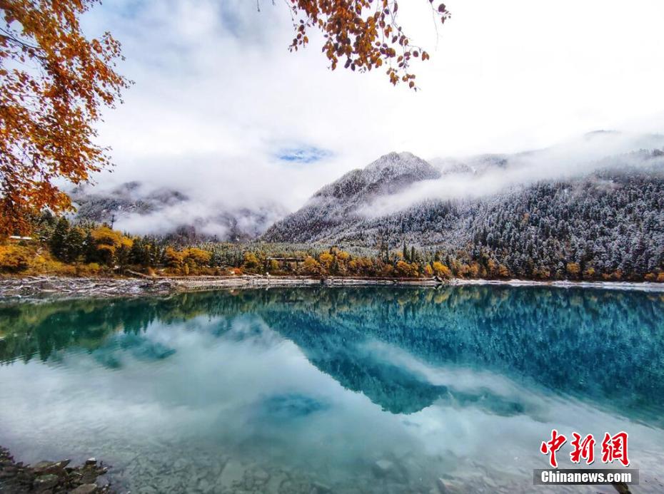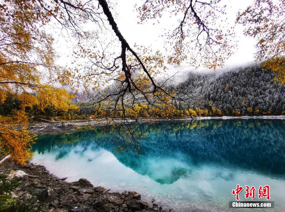 十月,九寨溝長(zhǎng)海、原始森林等景點(diǎn)迎來(lái)入秋后的第一場(chǎng)雪。澄凈碧藍(lán)的海子和金色的彩林與潔白的雪花相映相襯,構(gòu)成一幅靜謐的美麗畫(huà)卷。遠(yuǎn)遠(yuǎn)看去,成片的彩林被一朵朵雪花點(diǎn)綴,美得像童話世界一般。 梁峰 攝