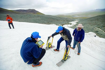 在格拉丹東雪山,科考隊員使用地質(zhì)雷達探測冰川。