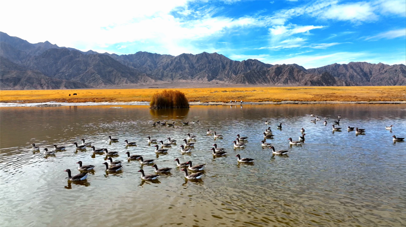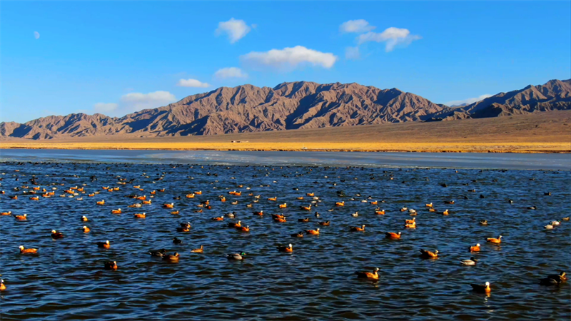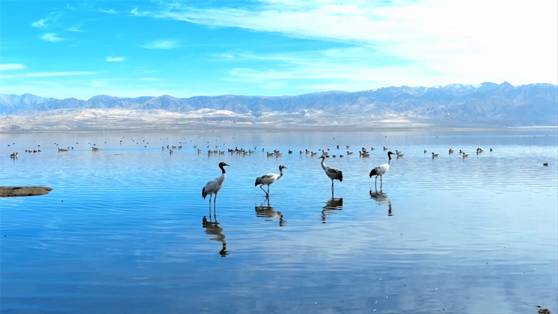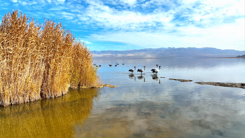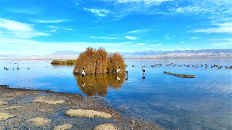 初冬時(shí)節(jié),在青海省海西蒙古族藏族自治州烏蘭縣都蘭湖國(guó)家濕地公園內(nèi),四只國(guó)家一級(jí)保護(hù)動(dòng)物黑頸鶴,踏著黑色細(xì)長(zhǎng)的腿在湖中閑庭信步,與斑頭雁、赤麻鴨一起嬉戲覓食,盡顯柴達(dá)木盆地濕地生態(tài)之美。