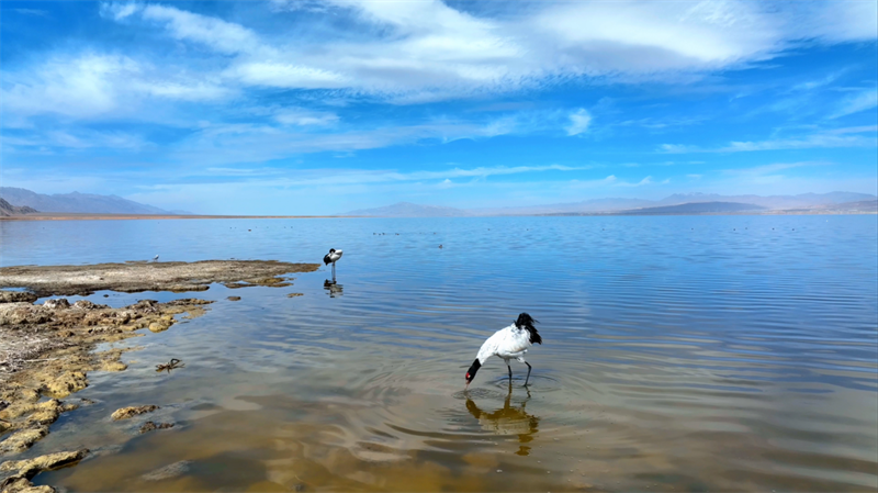 黑頸鶴在都蘭湖濕地。巴格生攝