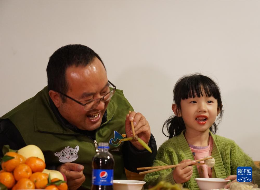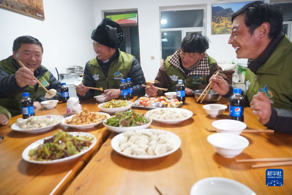 1月14日晚,管護員們在一起吃餃子。新華社記者 周盛盛 攝