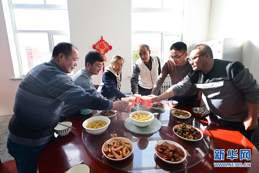 2月5日,在青藏集團(tuán)有限公司西寧供電段格爾木檢修車間,王永忠與同事們舉杯慶祝元宵節(jié)。新華社記者 張龍 攝
