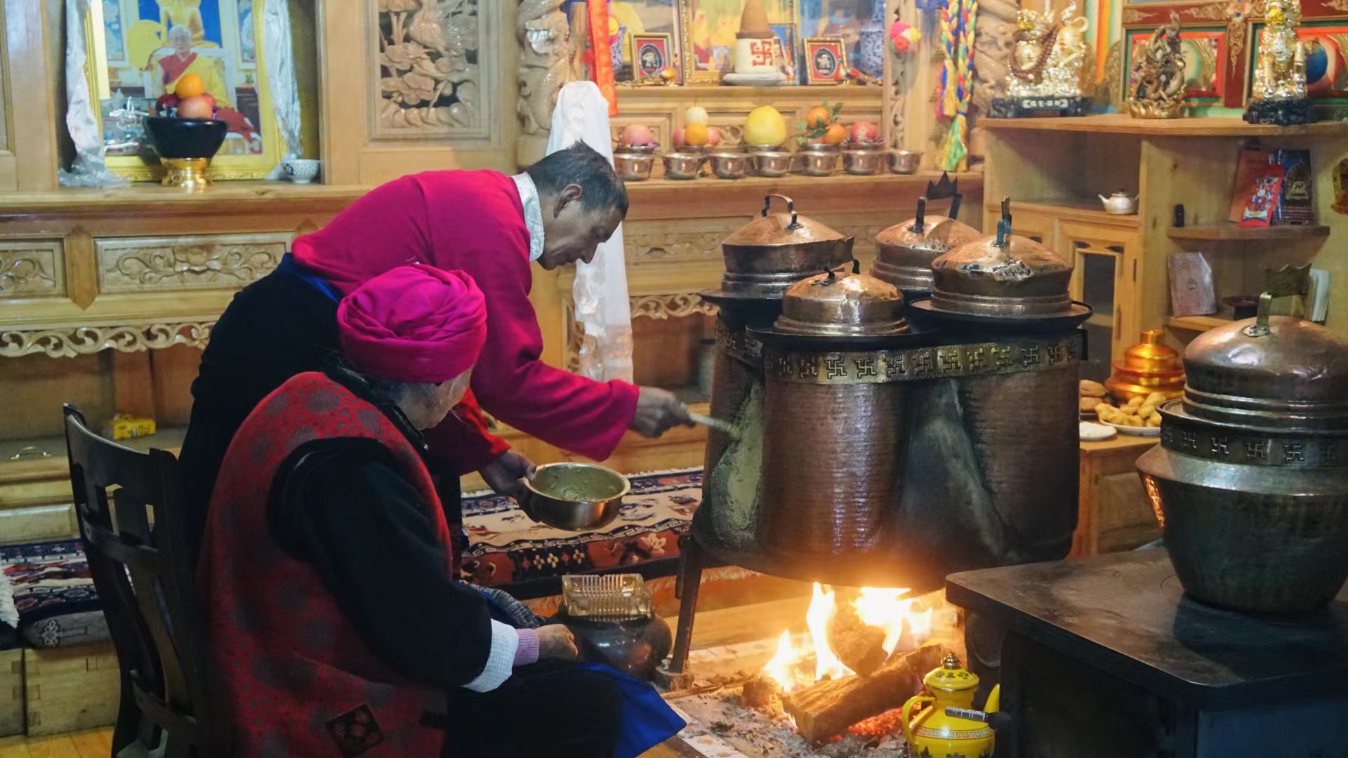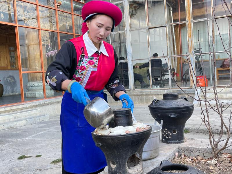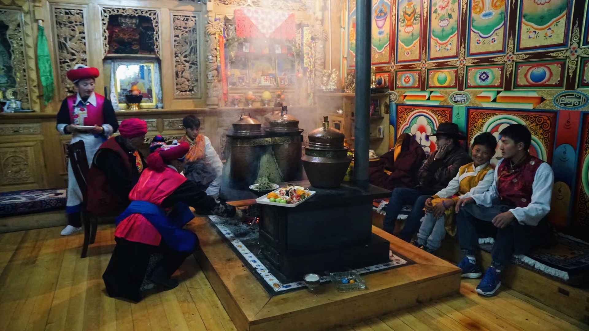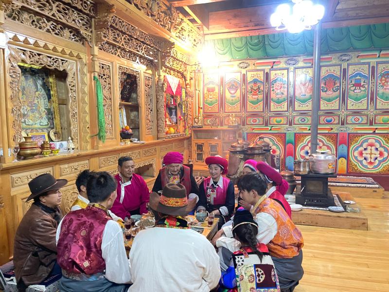 傍晚時(shí)分,“年夜飯”準(zhǔn)備完成,初稱站在火塘邊把剛和好的稀泥一層一層地刷到火塘上,“這是藏歷新年的添新土儀式(藏歷新年接福習(xí)俗),表示我們對來年日子風(fēng)調(diào)雨順、紅紅火火的美好期待?!背醴Q把這些傳統(tǒng)習(xí)俗認(rèn)真地教給家里的孩子們。