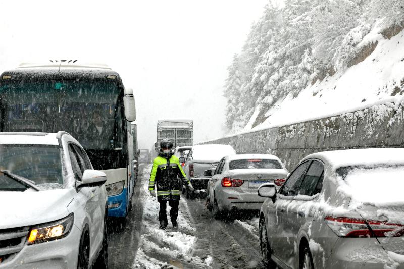2月22日,大雪使白馬雪山路面積雪結(jié)冰,導(dǎo)致上百輛汽車擁堵滯留,交警冒著嚴(yán)寒疏導(dǎo)交通。