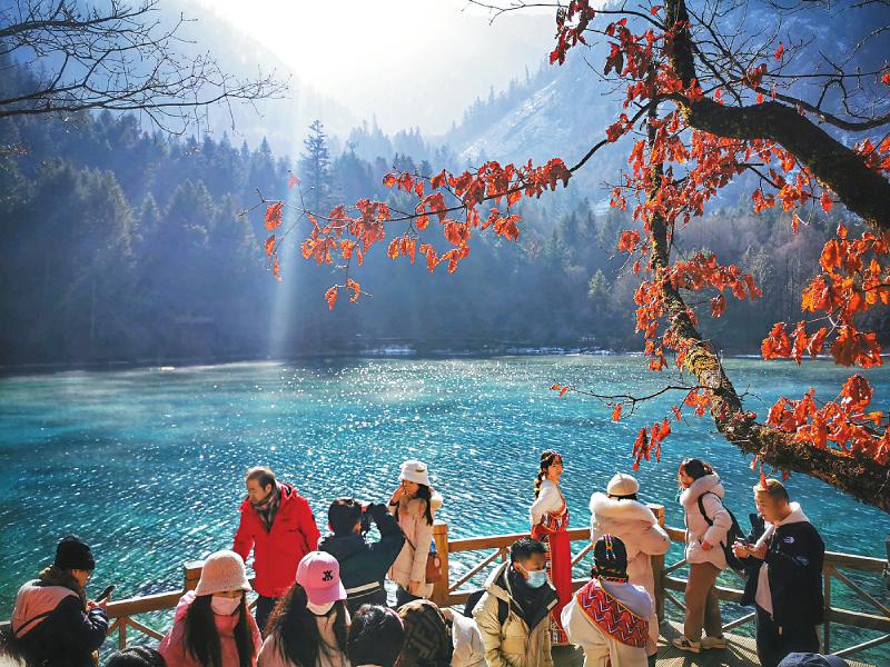 2月14日,來自遼寧的游客郭婷和男友在九寨溝風(fēng)景名勝區(qū)的五花海棧橋上拍了一組照片發(fā)在朋友圈,并配上文字:“兔年第一站,打卡九寨溝?!?/p>