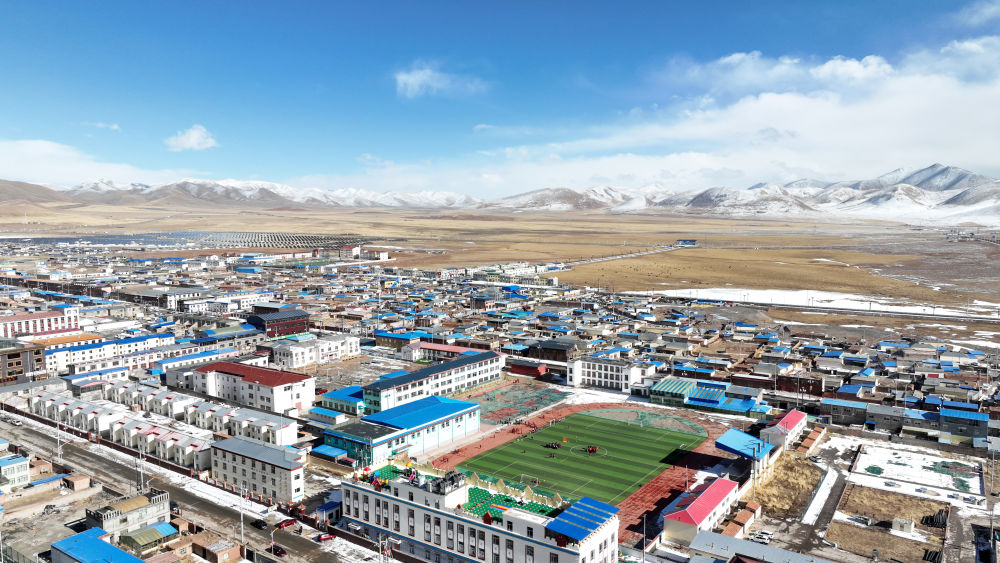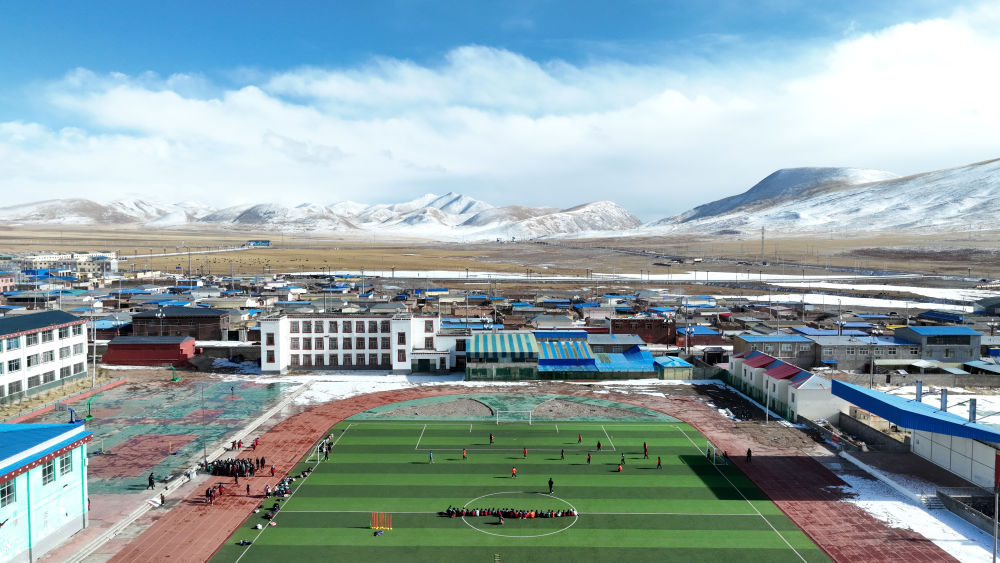 3月1日,在玉樹州曲麻萊縣,曲麻萊縣第一完全小學(xué)學(xué)生在足球課上(無(wú)人機(jī)照片)。新華社記者 張宏祥 攝