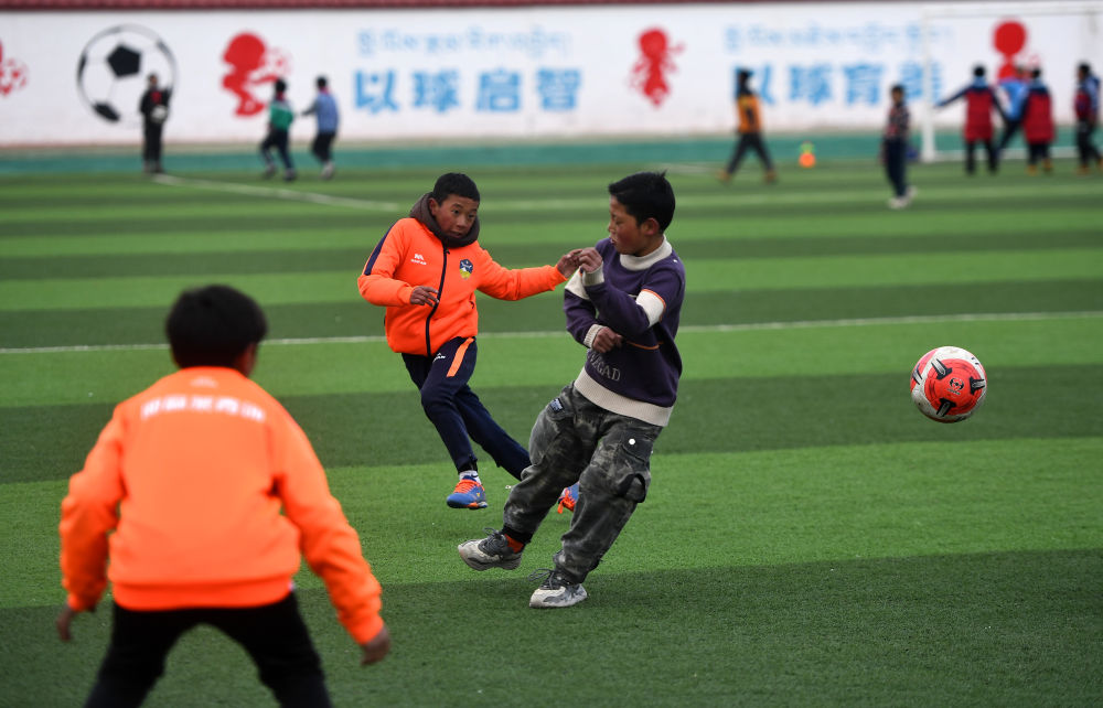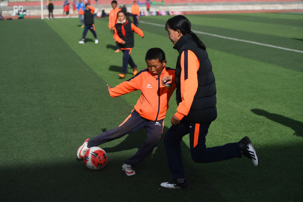 3月1日,在玉樹州治多縣,吉尕小學(xué)學(xué)生在足球訓(xùn)練課上。新華社記者 張宏祥 攝