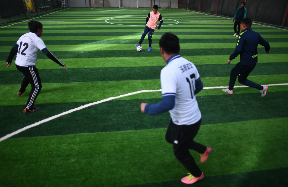 3月2日,在玉樹州玉樹市一處室內(nèi)球場(chǎng),幾名足球愛(ài)好者正在踢球。新華社記者 張宏祥 攝