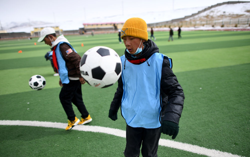 3月1日,在玉樹州曲麻萊縣第一完全小學(xué),曲麻萊青訓(xùn)隊(duì)球員在訓(xùn)練課上。新華社記者 張宏祥 攝