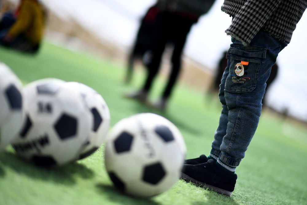 3月1日,在玉樹州治多縣,城南幼兒園小朋友旦增然桑(左一)在練習(xí)射門。新華社記者 張宏祥 攝