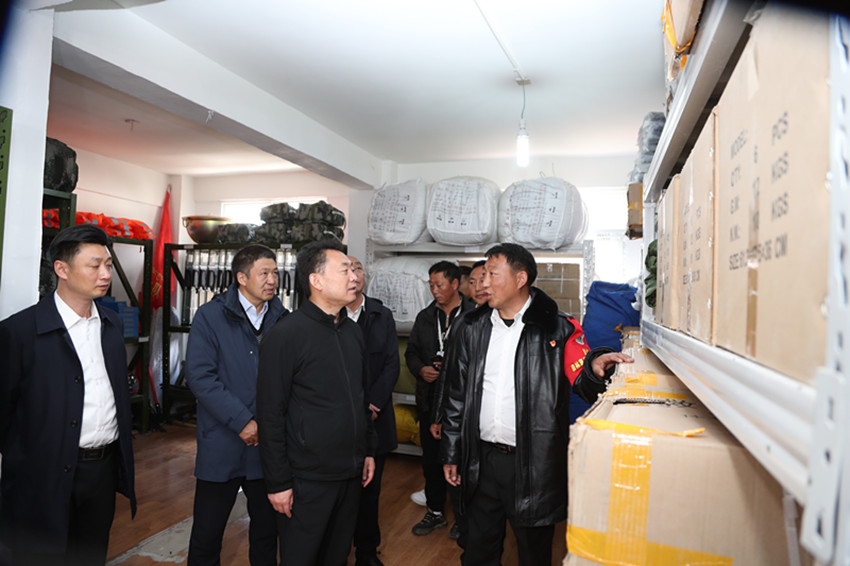 沈陽在理塘縣麥洼鄉(xiāng)察看應(yīng)急物資儲(chǔ)備情況。