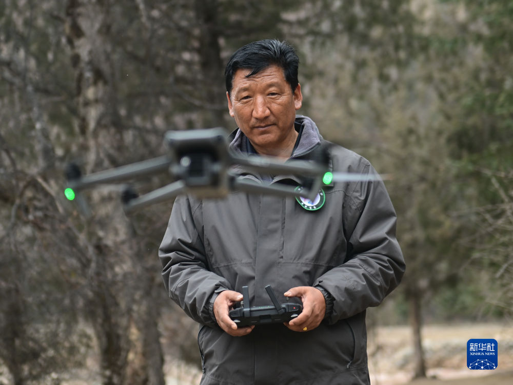 3月24日,在青海省黃南藏族自治州麥秀林場(chǎng),護(hù)林員使用無人機(jī)巡護(hù)林區(qū)。新華社記者 王艷 攝