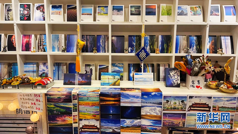 文創(chuàng)小店的店員汪小小向記者介紹:“這些圖案都是我們自己拍攝的,目的就是讓它們‘飛’到全國各地、全世界,讓更多人看到青海美景。我們的明信片還可以代寄,與之相匹配的還有特色郵戳,蓋在明信片上很有儀式感。”汪小小說。