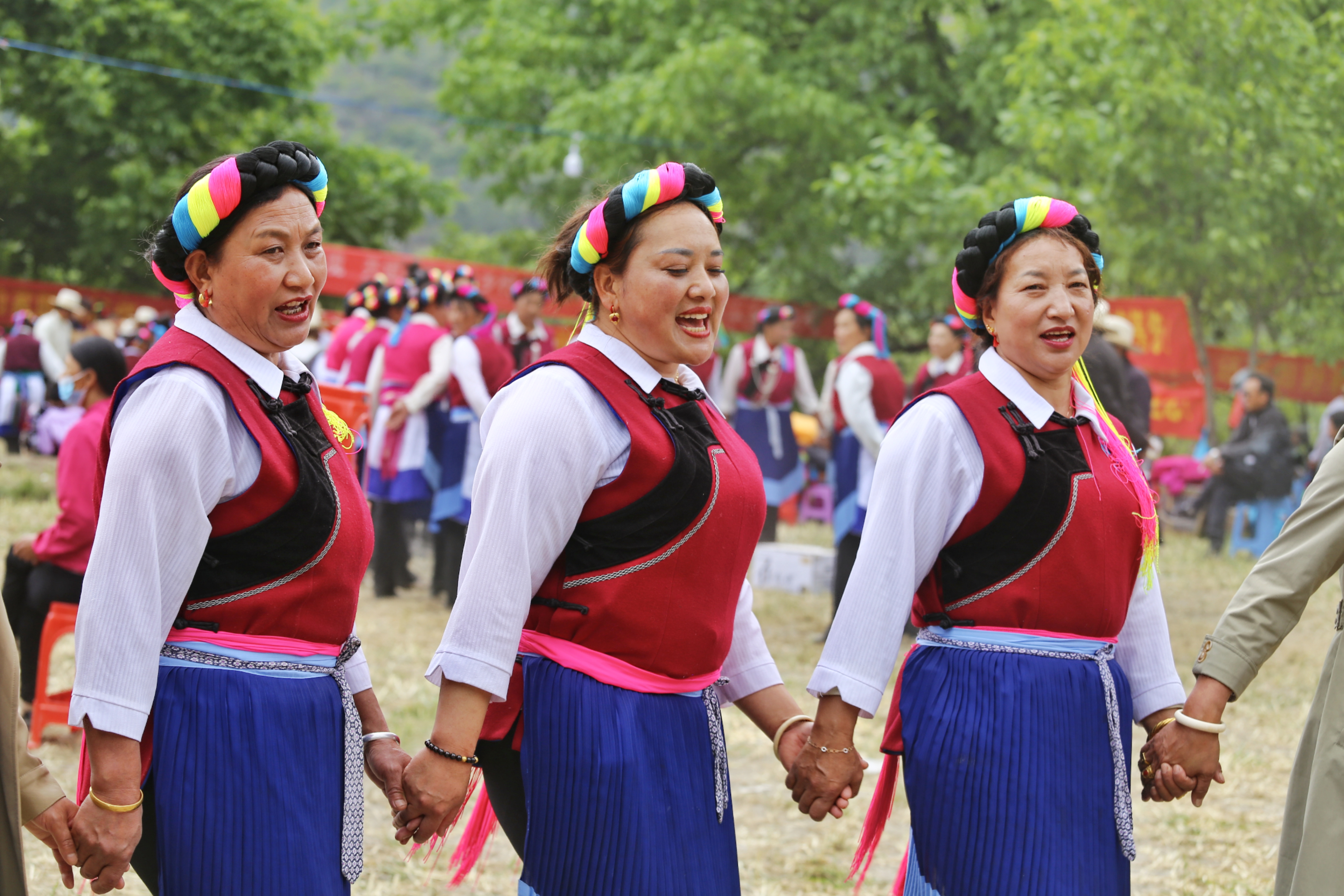藝術(shù)節(jié)開幕式上,《最美的歌兒唱給黨》《傳統(tǒng)熱巴》《編雙草鞋送紅軍》《犁田調(diào)》《遇見卓瑪》等節(jié)目向觀眾展示了其宗厚重的文化底蘊和村民生活的變化。伴隨著悠揚的歌聲,“四縣”各族兒女手挽手、肩并肩,圍成同心圓共舞“千人鍋莊”,水袖揮舞,褶裙搖曳,場面壯觀,游客們紛紛拿出手機記錄這場視覺盛宴。