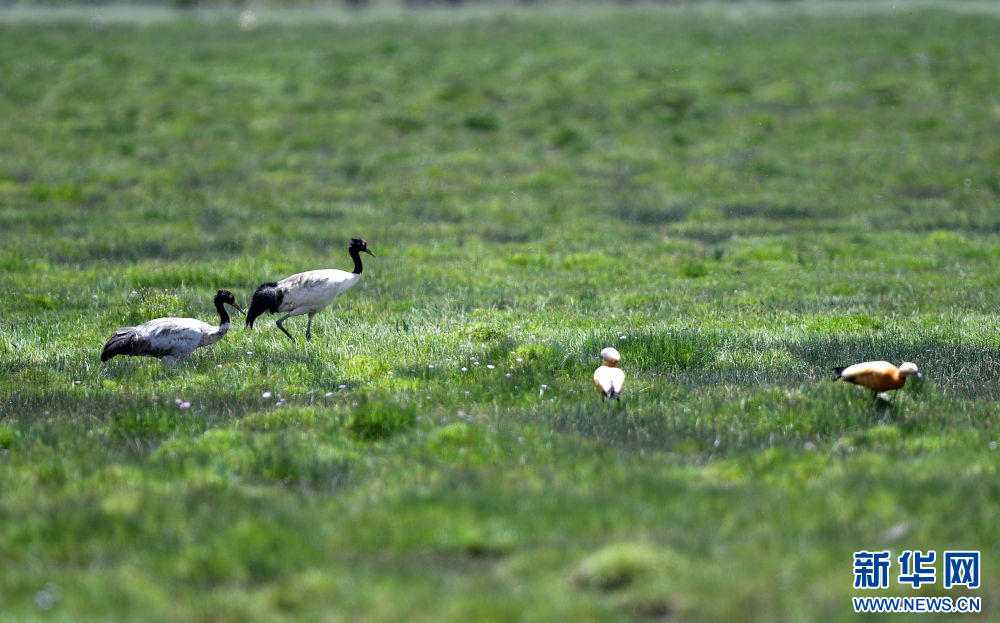 兩只黑頸鶴在青海隆寶國家級自然保護(hù)區(qū)內(nèi)活動。新華社記者 韓方方 攝