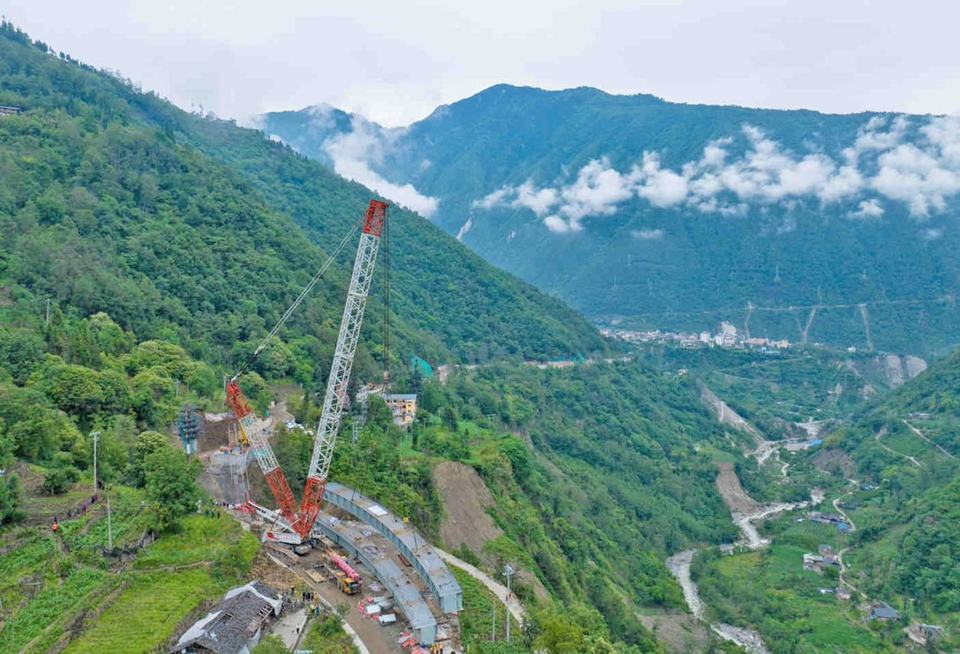 項目現場相關負責人介紹,海螺溝景區(qū)道路災后恢復重建工程地處鮮水河斷裂帶,道路狹窄曲折,作業(yè)面極其有限,受去年瀘定地震影響,山體巖性愈加破碎,土質更加疏松,施工難度極大,安全風險極高。為滿足原材料軋制能力及運輸界限要求,在鋼箱梁制作時,按照設計要求,將嘎木構大橋鋼箱梁累計劃分為14個節(jié)段進行制造,運輸至現場后拼裝成兩個主梁大節(jié)段,采用650噸履帶吊分幅開展吊裝作業(yè),其中內弧長57.708米,重約140噸,外弧長61.753米,重約145噸。