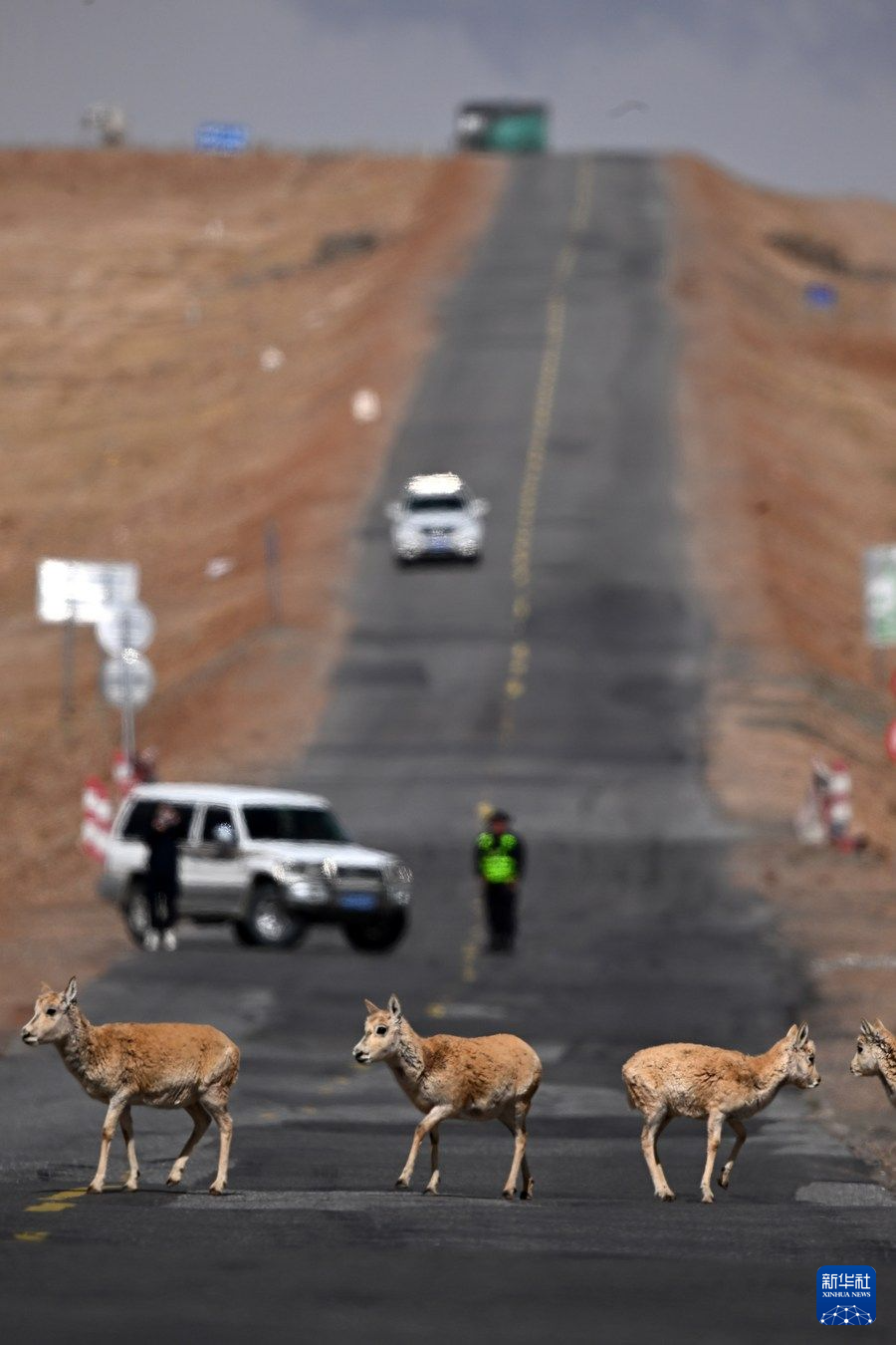 5月28日,在青??煽晌骼铮蝗捍菩源a(chǎn)藏羚羊通過(guò)青藏公路。新華社記者 張宏祥 攝