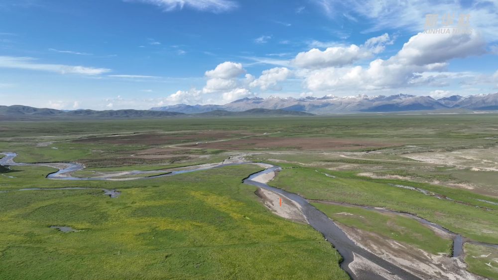 夏日,青海省南部的高原草原一碧千里,與雪山、白云相映成趣,景色宜人。