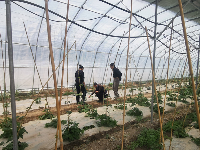 農(nóng)技員在蔬菜大棚指導(dǎo)農(nóng)戶進行科學(xué)管護。