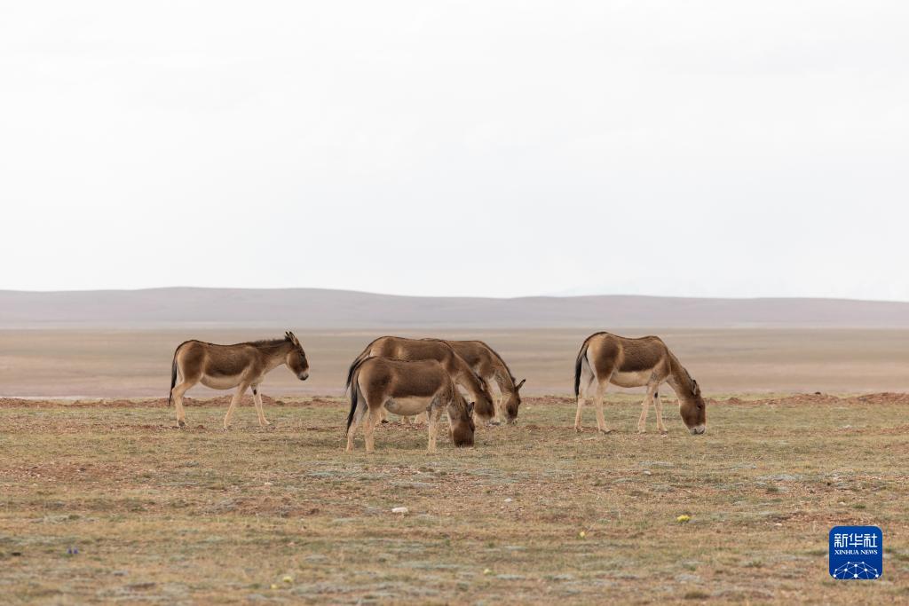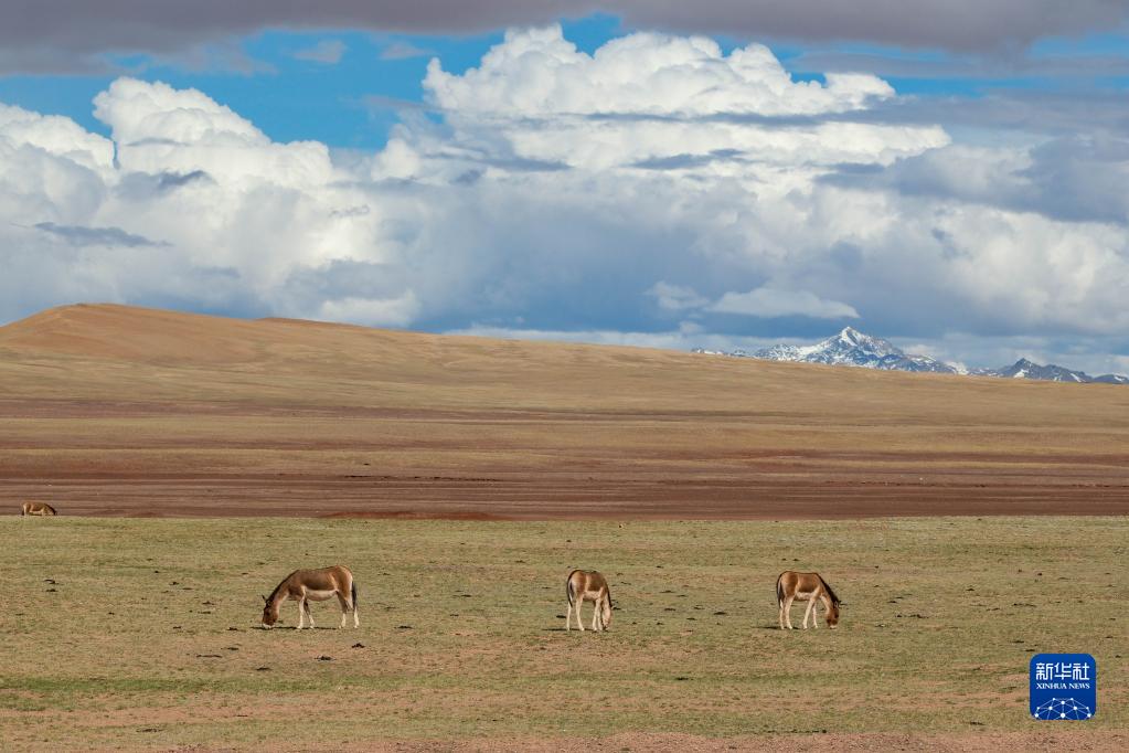 6月15日,在長江源地區(qū)的楚瑪爾河附近,幾只藏野驢在覓食。新華社記者 金立旺 攝