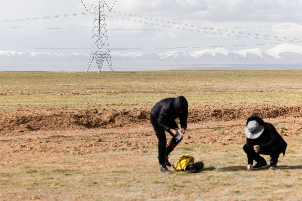 6月15日,中國科學院西北高原生物研究所研究員連新明(右)和他的學生王東在可可西里采集藏羚羊新鮮糞便樣本。