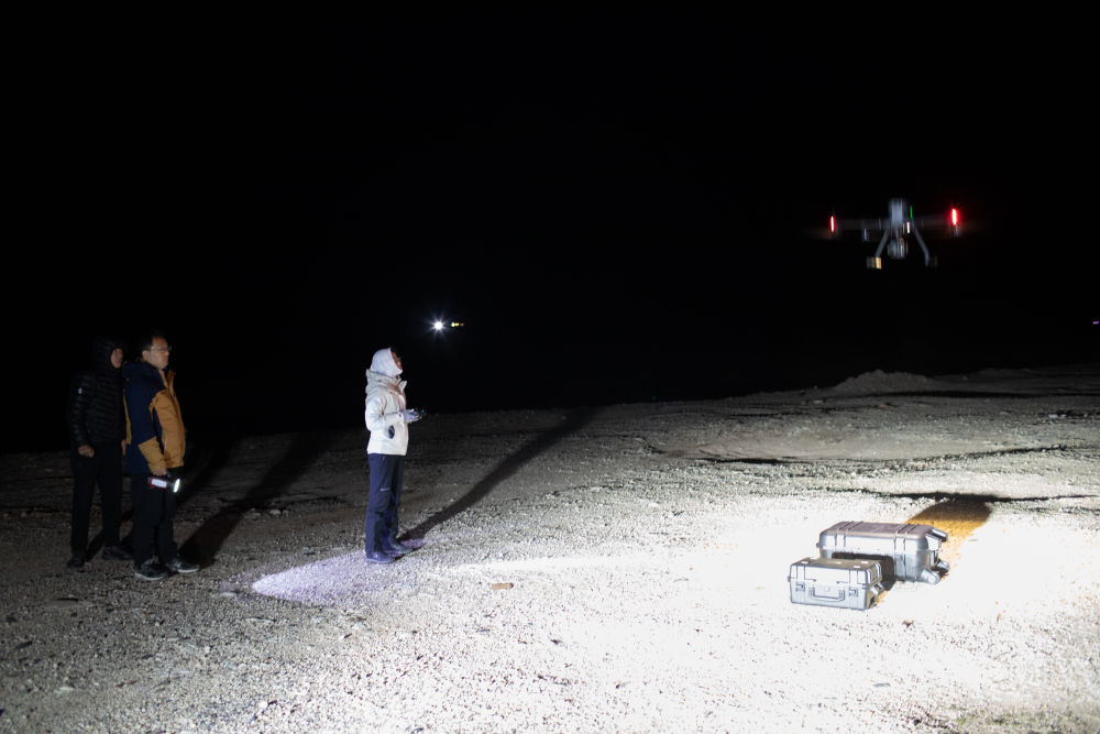 6月16日凌晨,連新明團隊在青藏公路楚瑪爾河大橋附近,使用無人機監(jiān)測藏羚羊遷徙途中的夜宿地。