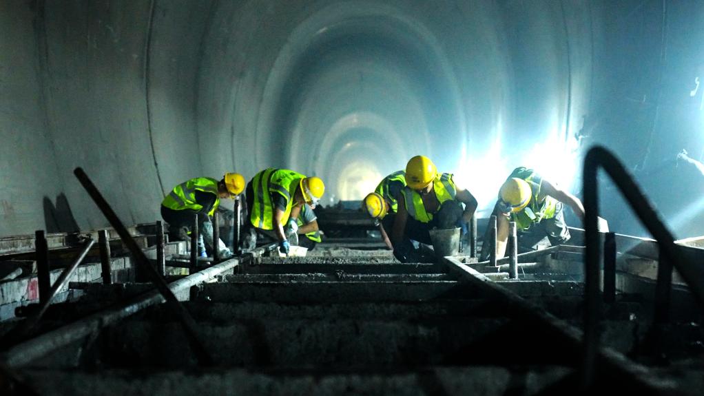 7月8日,滇藏鐵路麗香段哈巴雪山隧道內(nèi),建設(shè)者進行無砟道床施工。新華社記者 丁怡全 攝