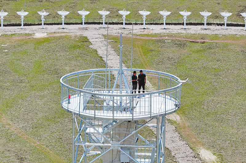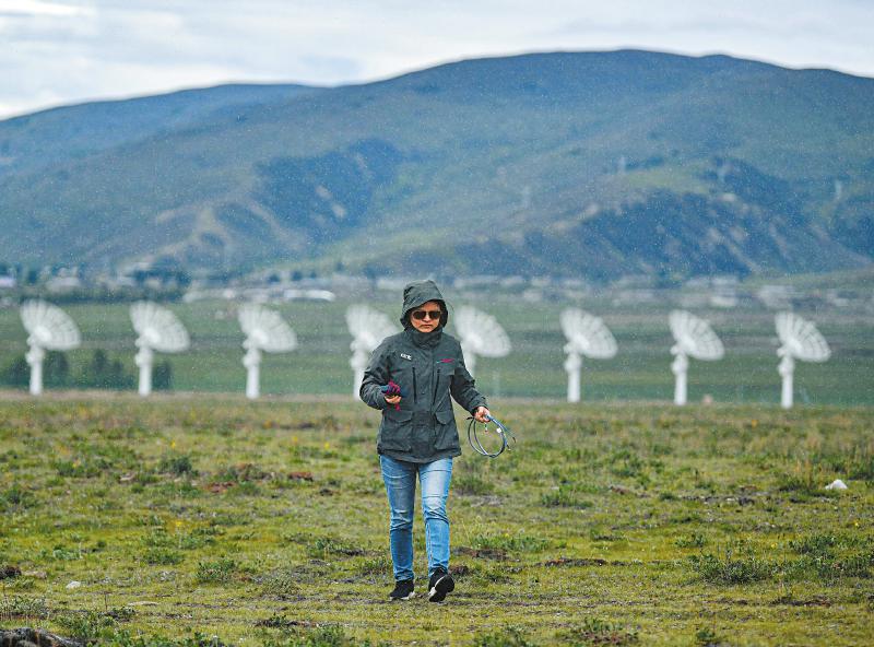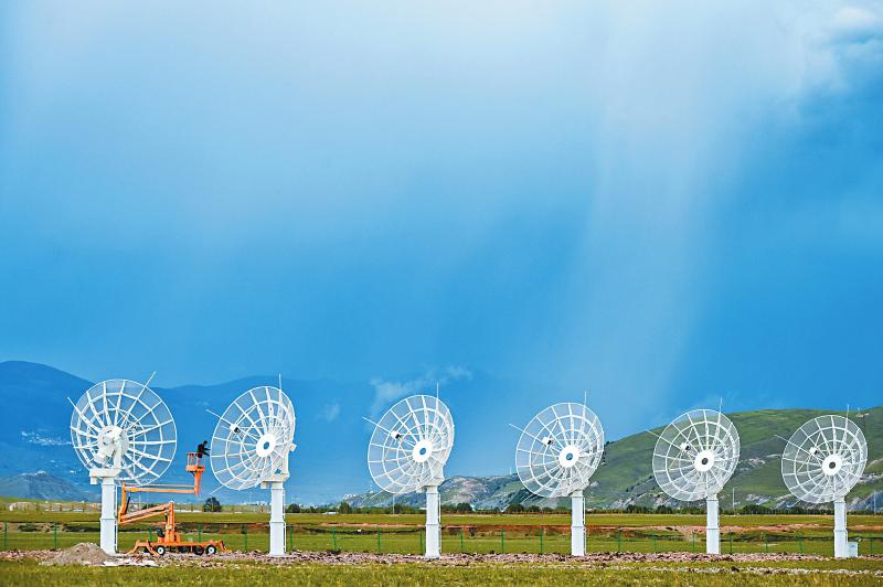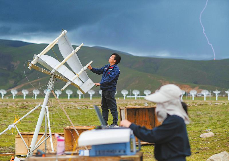 7月8日,四川省甘孜州稻城縣噶通鎮(zhèn)天氣說變就變。在國家重大科技基礎(chǔ)設(shè)施——空間環(huán)境地基綜合監(jiān)測網(wǎng)(子午工程二期)圓環(huán)陣太陽射電成像望遠鏡項目建設(shè)現(xiàn)場,中國電科第39研究所現(xiàn)場施工負責人葉愛林和同事正在進行天線增益調(diào)試實驗。突然,一道閃電劃過天際,轟隆隆的雷聲過后便是傾盆大雨,葉愛林和同事不得不停下手中正在進行的實驗,臨時找地方躲雨?!斑@雨下不了多久,等雨停了,我們再繼續(xù)?!痹陧椖拷ㄔO(shè)現(xiàn)場已工作了480多天的他,被同事們稱作半個氣象“土專家”。他不僅能“察言觀色”看懂高原上的云彩,還能大差不差地推測出天氣變化。在海拔3800多米的噶通鎮(zhèn),許多科研人員像葉愛林一樣,默默奮戰(zhàn),希望在建的這一國家重大科技基礎(chǔ)設(shè)施能早日運行,為中國空間科學(xué)事業(yè)的發(fā)展提供關(guān)鍵性的探索幫助及技術(shù)支持,使我國步入世界空間科學(xué)領(lǐng)域的先進行列。
