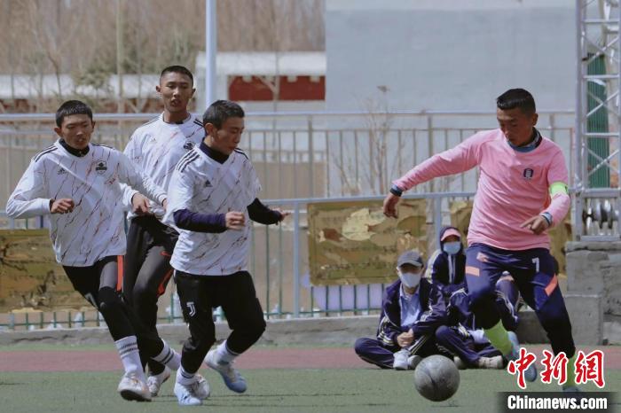 圖為玉樹州第二民族高級(jí)中學(xué)的學(xué)生在踢球。(資料圖片)中新社發(fā) 昂旺卓瑪攝