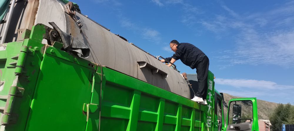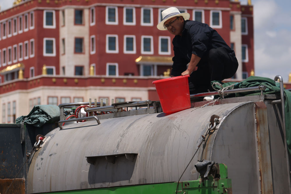 車輛進(jìn)入一處服務(wù)區(qū)后,緩緩?fù)?吭诼愤?。李瑾翻身跳下車去,爬?米多高的車頂,打開水箱蓋細(xì)細(xì)查看,有幾條小魚在水面上游動(dòng)著,似乎好奇地向外張望。